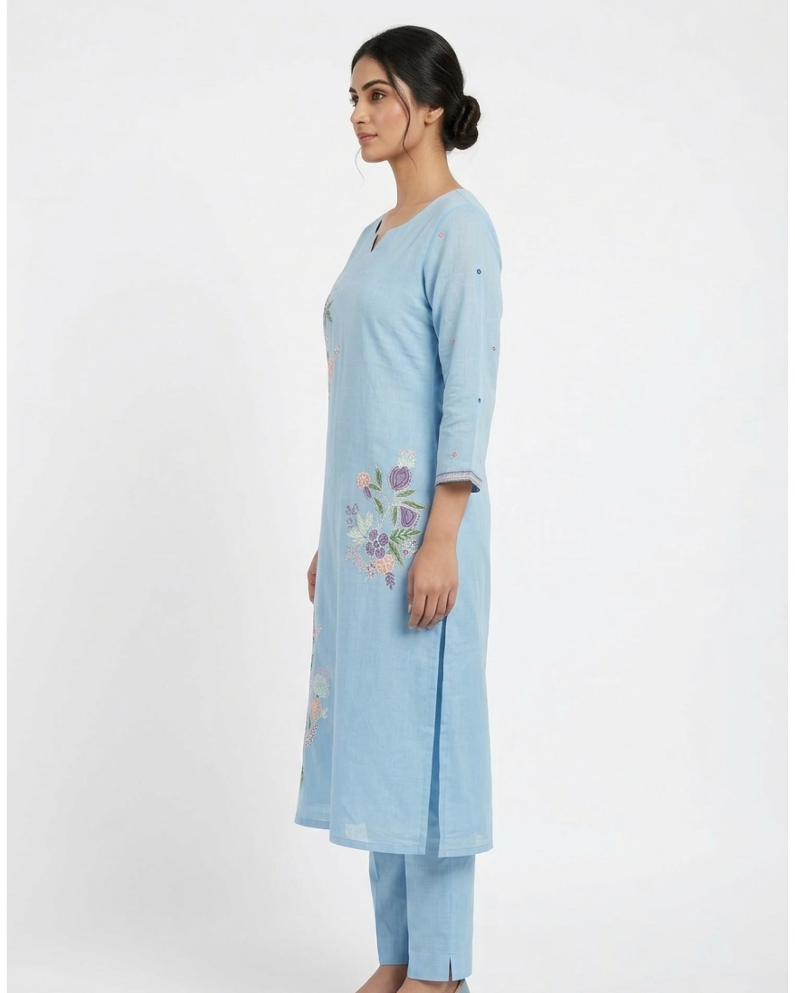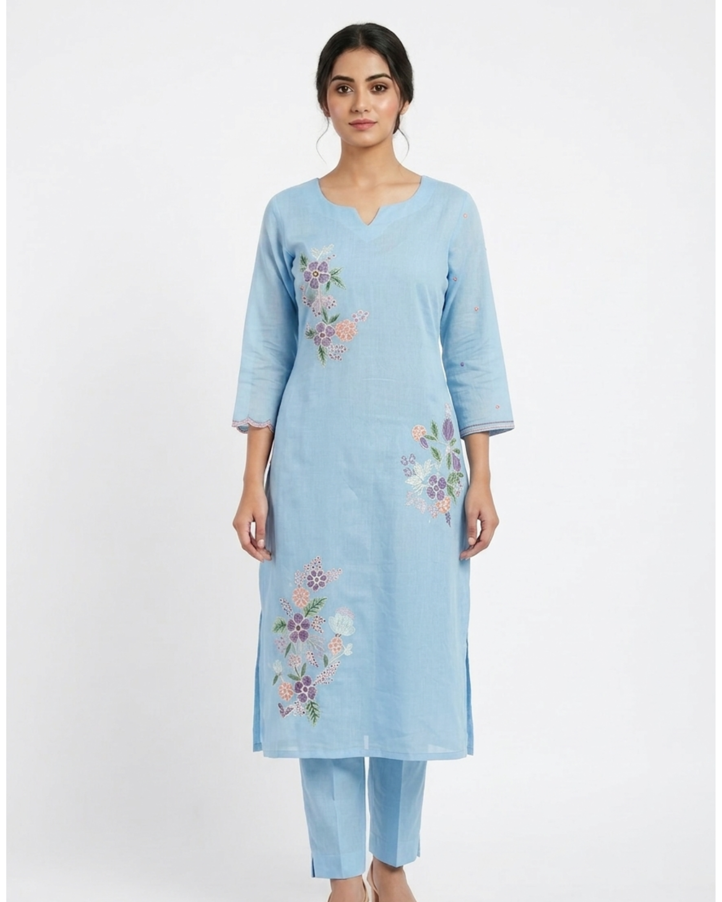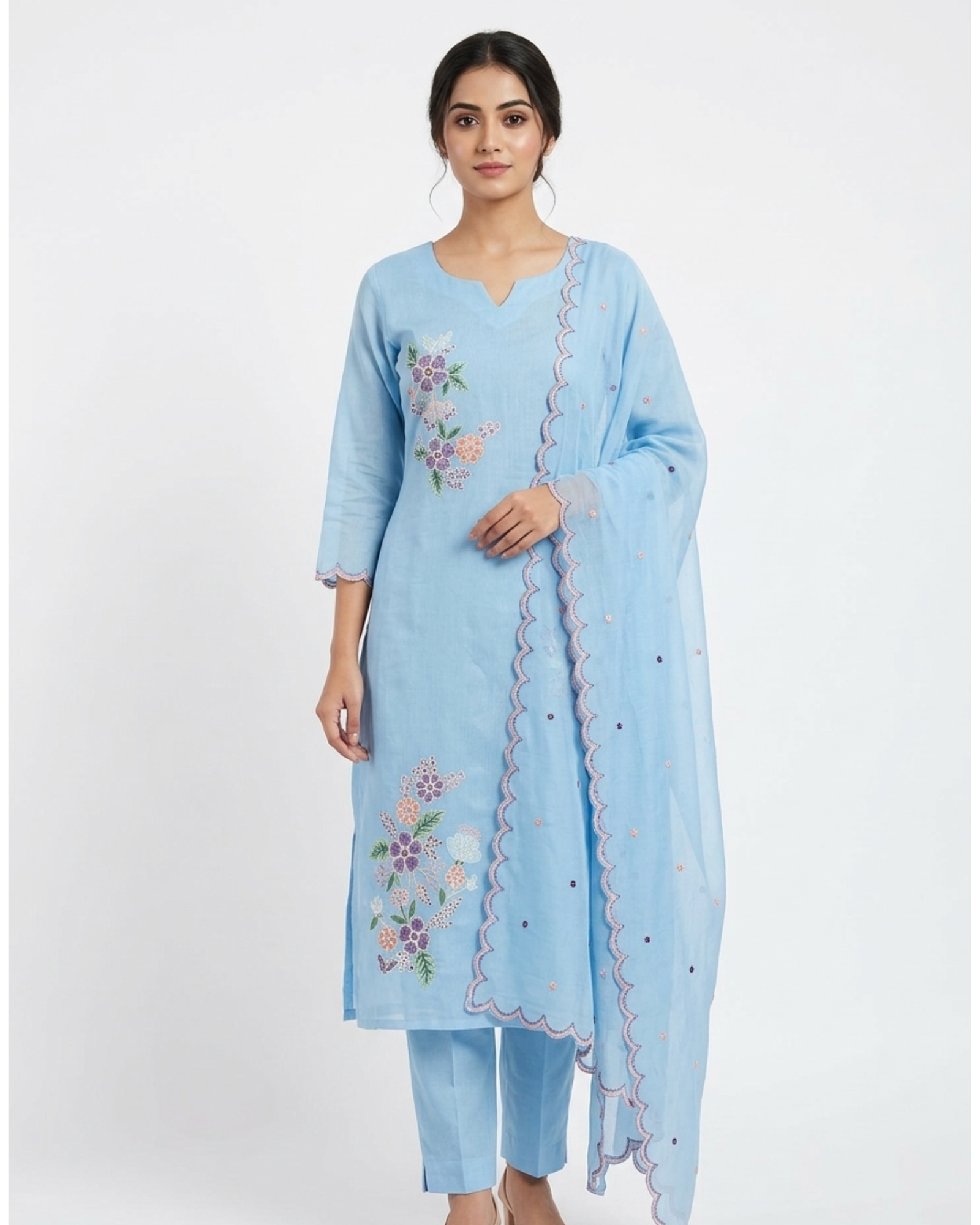 A graceful powder blue kurti set adorned with delicate floral embroidery in soft pastel tones. Designed with a flattering neckline, relaxed straight silhouette, and paired with matching pants and a sheer scalloped dupatta, this ensemble blends elegance with everyday comfort—perfect for festive brunches, intimate celebrations, and effortless ethnic styling.
