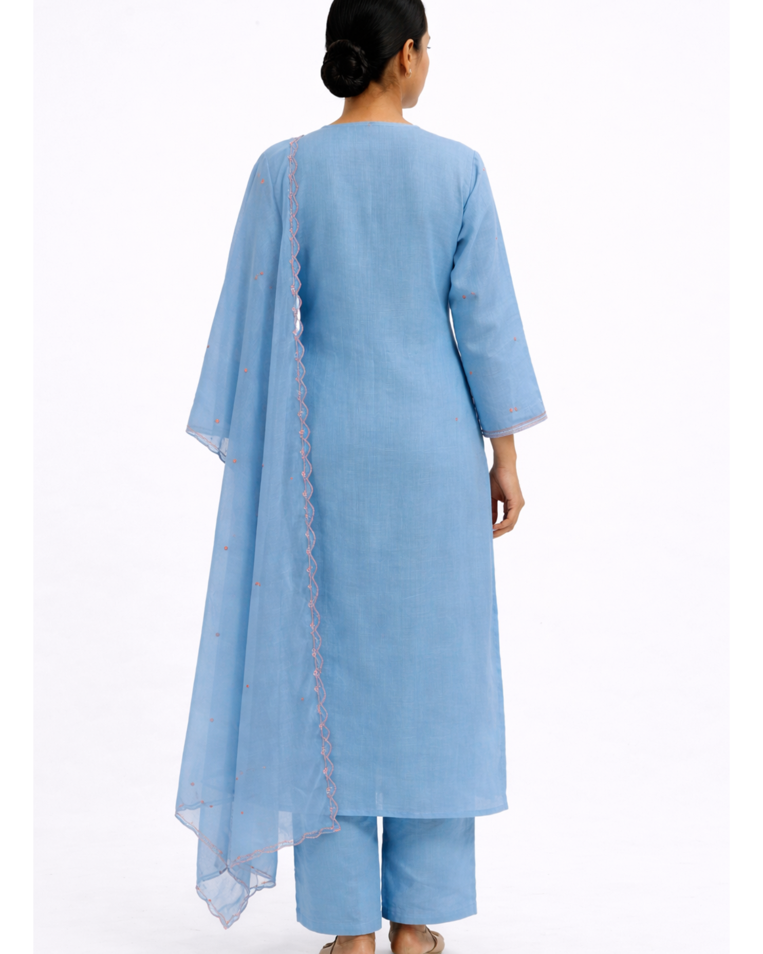 The kurti is designed with a notched neckline and three-quarter sleeves with fine border accents, offering a flattering and comfortable fit. Paired with matching straight pants and a lightweight sheer dupatta finished with scalloped edging, the ensemble flows beautifully and adds a touch of femininity to every movement.