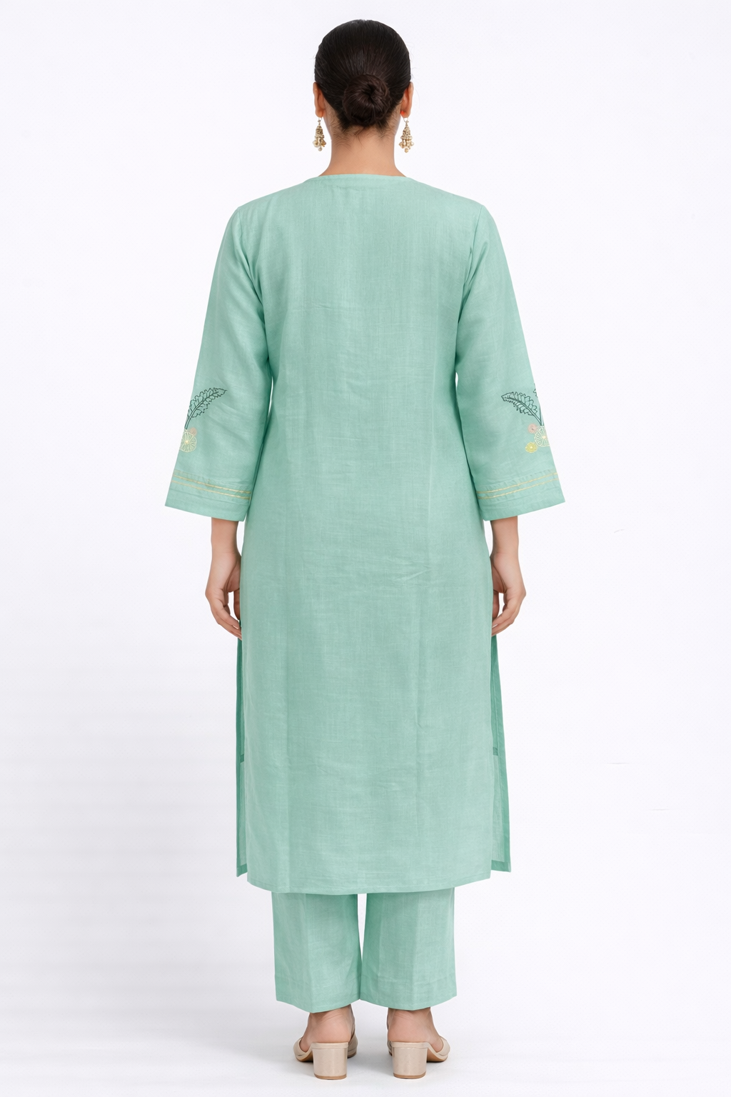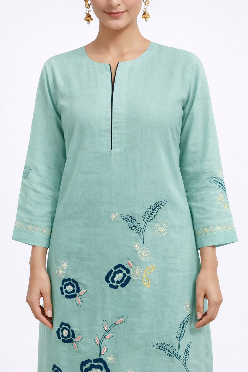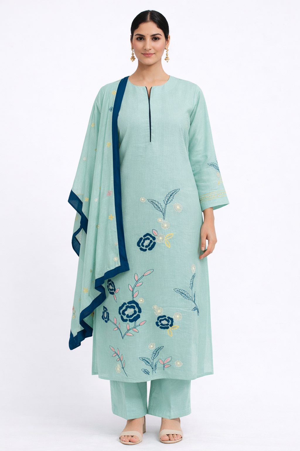 & Free ShippingGraceful and effortlessly elegant, the Mint Azure Floral Embroidered Kurti Set blends minimal design with delicate botanical artistry. Crafted in a soothing mint aqua tone, the kurti features fine floral embroidery scattered across the silhouette with statement motifs blooming along the hem.